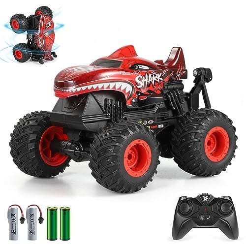 DYODYORC Monster Truck Shark RC 2.4Ghz All Terrain Remote Control Car with Music and 3 Lighting Effects 360 Stunt Capable Toy for Boys and Girls Red