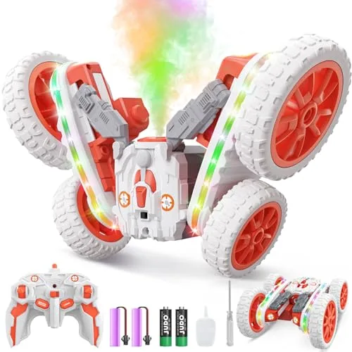 Jimdella Remote Control Cars Trucks RC Stunt Car with 360 Rotating 4WD Spray Function and LED Lights for Kids Ages 4 12 Orange White